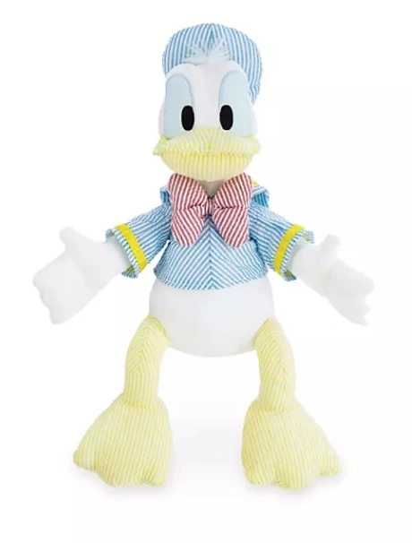 Seersucker, or railroad stripe, is a traditional fabric weave often used in suits and shirts — and now for designer Disney plush! Our Donald Duck soft toy is finely sculpted in puckered, wrinkly, seersucker striped material for a classic look that collectors will love!